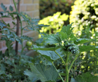 Ontluikende stokroos en tomaat op de achtergrond