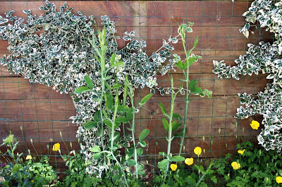 Ondanks dat ze zichzelf geen uitgesproken siertuinierders vinden, staan er wel heel veel bloeiende planten en struiken in de tuin. In de border staan onder andere klokjesbloem, hemelsleutel, scheefkelk, anjers, guldenroede en klaprozen. Langs de garage klimt een kamperfoelie. Pronkerwt, duizendschoon en slaapmutsje vind je terug in de border, langs de schutting en zelfs in kieren tegen de gevel. In potten staan een aantal tomaten- en peperplanten (jalapenos). Langs de gevel van de aanbouw groeien drie grote druivenranken met een blauwe druif.