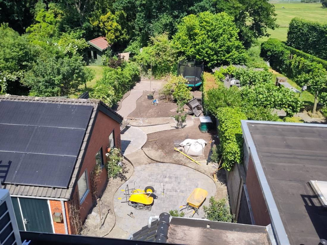 Gelukkig kreeg de tuin in de loop van 2023 steeds meer de vorm die het stel voor ogen had. Ieder vrij uurtje werd benut. Samen met Anne-Marie en haar moeder – die een deel van de planten leverde – werden met paaltjes en draden de borders uitgemeten en de eerste planten uitgezet. Een stratenmaker legde de paden en terrassen aan. Na enig advies kozen ze er vervolgens voor om de tuin achter op te hogen. De oprit werd voorzien van grind waardoor het water beter weg kan zakken en er geen modder meer in huis wordt gelopen.