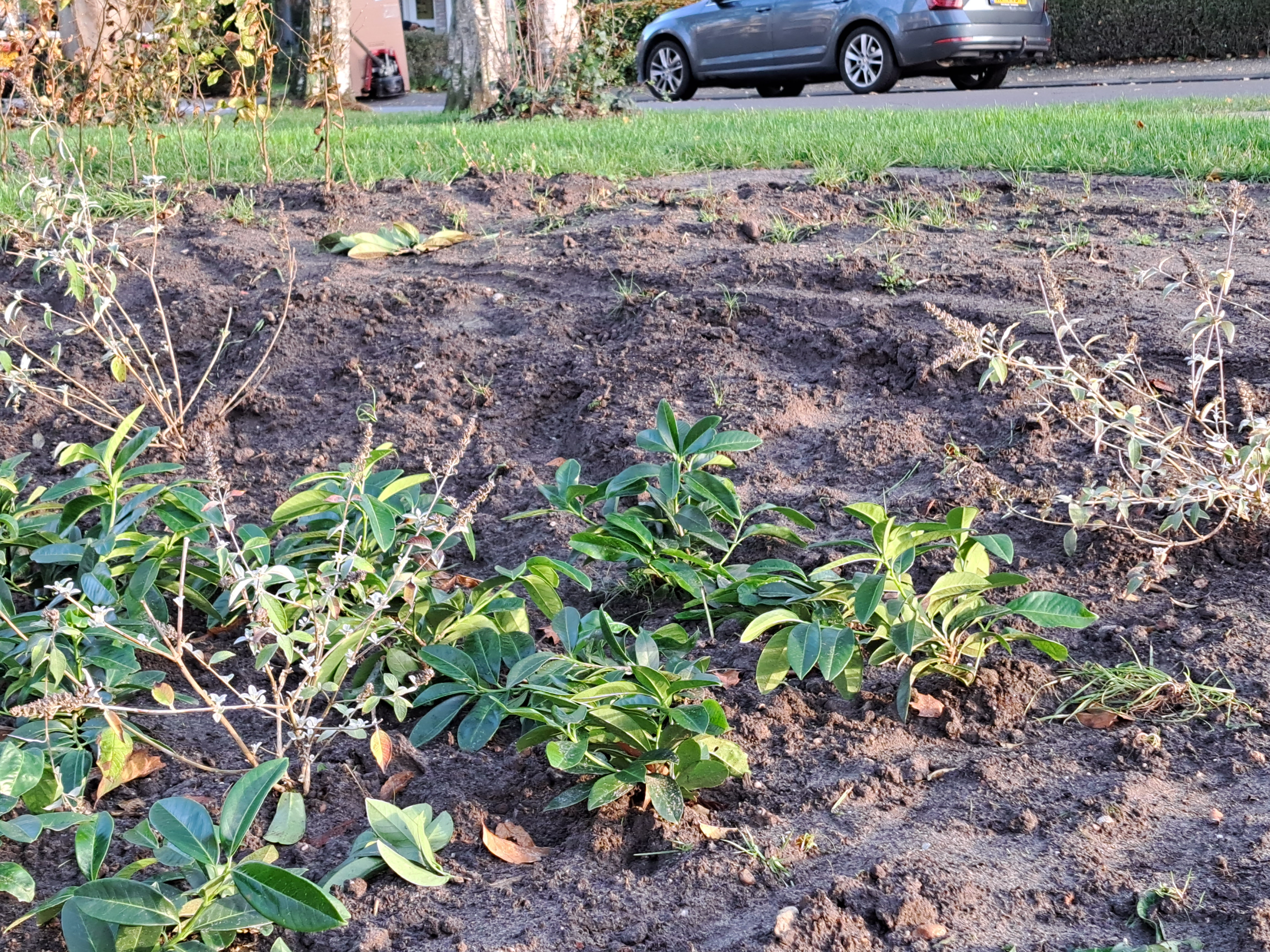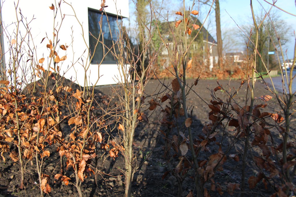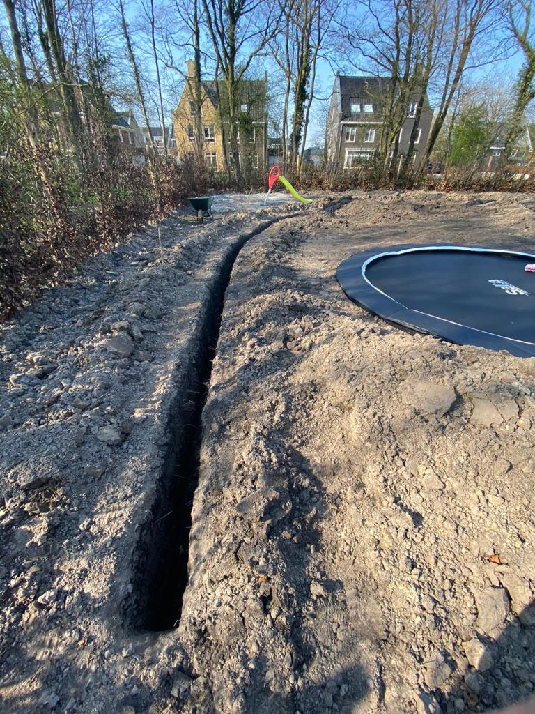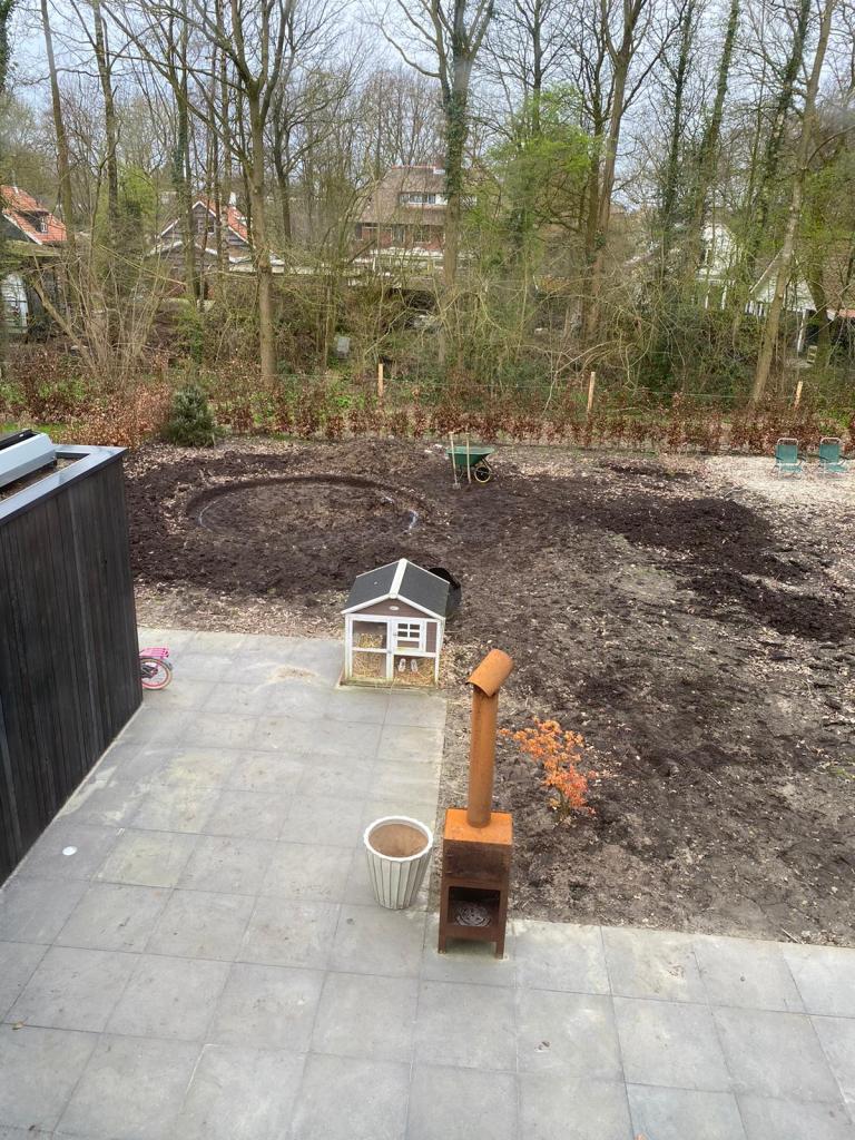 Op de bestrating na, legden Coby en Jan zelf de tuin aan. Voordat ze van start konden met de uitwerking van het plan, werd er eerst het nodige voorwerk verricht. In overleg met de buren en met behulp van een minikraan van een familielid, werd er begin 2023 een grote coniferenhaag uitgehaald. Coby: “Dat was één van de eerste echte klussen in de tuin. Ik weet nog dat het sneeuwde. Het zal februari zijn geweest.” Ook kwamen ze in de tuin een aantal ‘verrassingen’ tegen.
