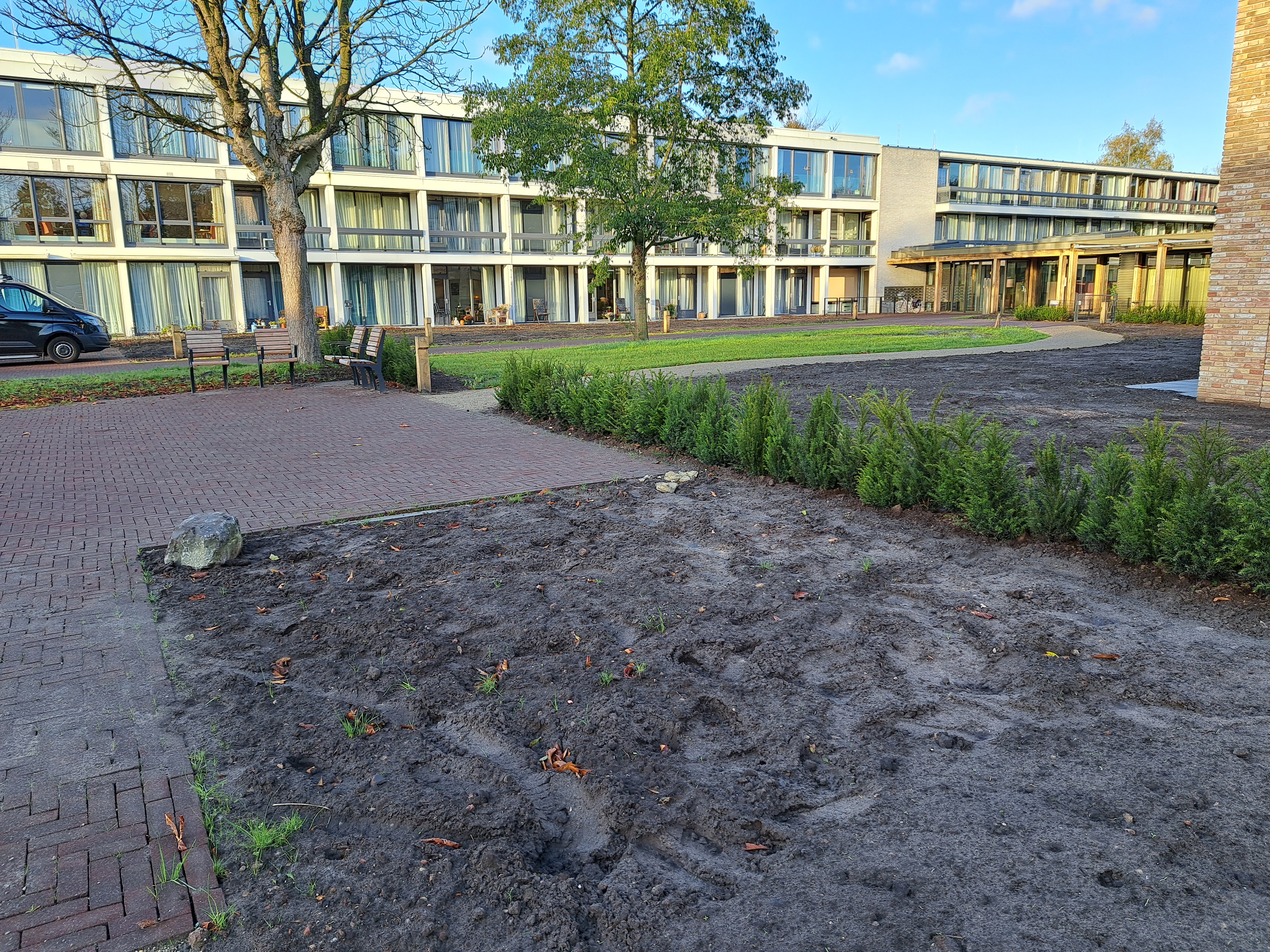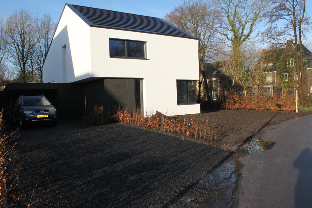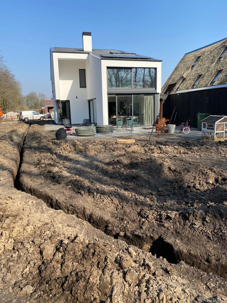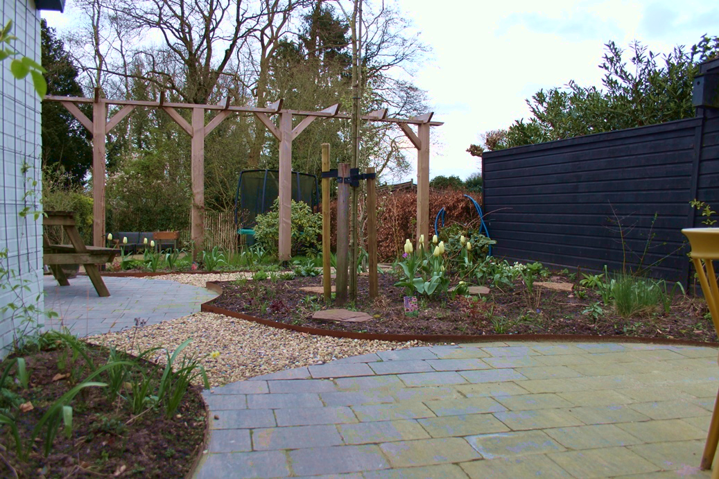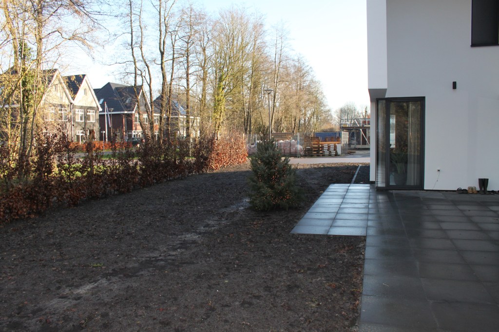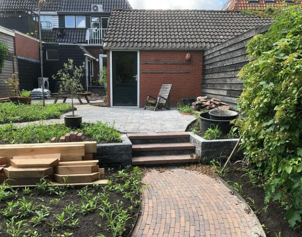 Gelukkig kreeg de tuin in de loop van 2023 steeds meer de vorm die het stel voor ogen had. Ieder vrij uurtje werd benut. Samen met Anne-Marie en haar moeder – die een deel van de planten leverde – werden met paaltjes en draden de borders uitgemeten en de eerste planten uitgezet. Een stratenmaker legde de paden en terrassen aan. Na enig advies kozen ze er vervolgens voor om de tuin achter op te hogen. De oprit werd voorzien van grind waardoor het water beter weg kan zakken en er geen modder meer in huis wordt gelopen.
