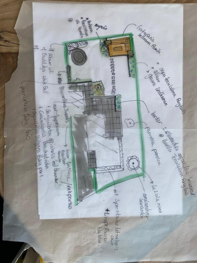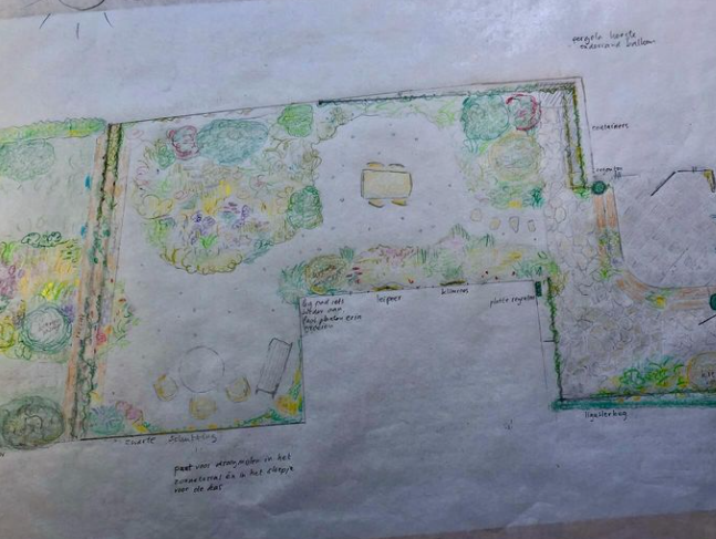 Die natte plekken waren sowieso een probleem in deze tuin. Het huis staat namelijk hoog en droog op de Hondsrug, maar gedeeltes van de tuin liggen een stuk lager. In periodes van regen was de oprit daardoor één grote modderpoel en achter in de tuin ontstond regelmatig een grote plas die niet meer wegtrok. Ook voor de indeling van de lange, rechte tuin konden Coby en Jan wel wat ideeën gebruiken. Dus schakelden ze de hulp in van tuinontwerper Anne-Marie Beck. Aan de hand van gesprekken, wensen en moodboards maakte zij een ontwerp met stappenplan voor een natuurlijke tuin met hoogteverschillen, ronde vormen en heel veel planten.