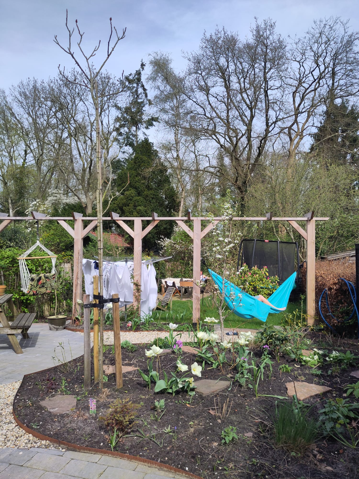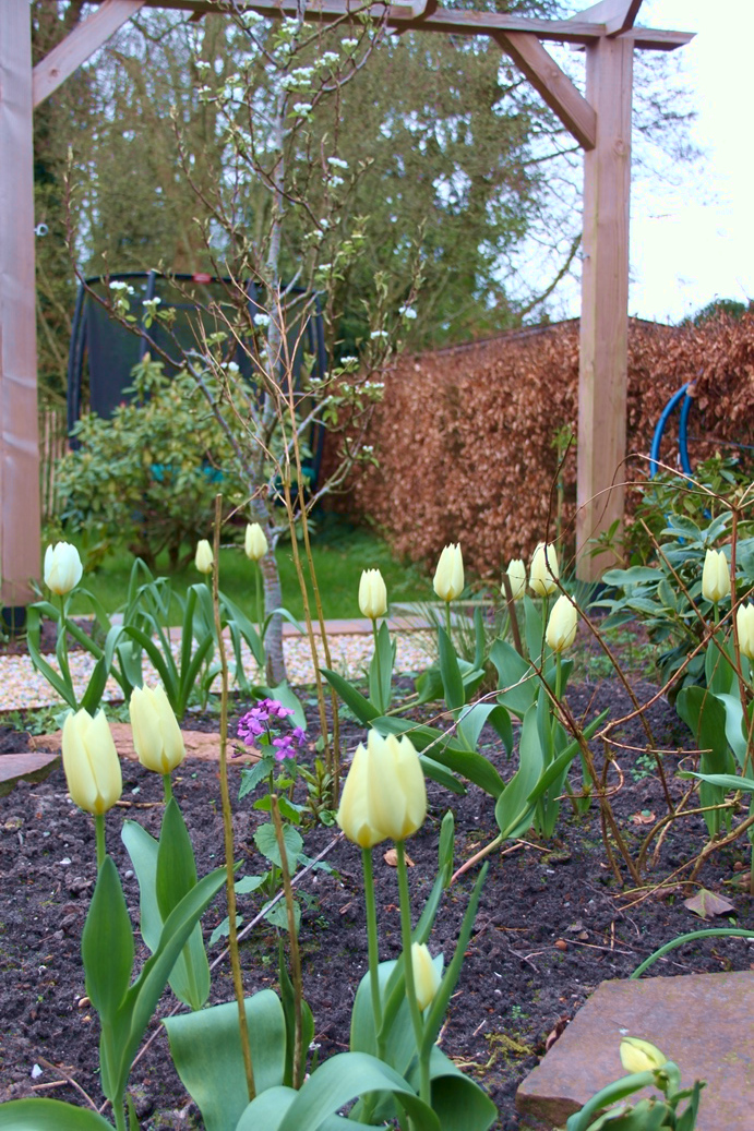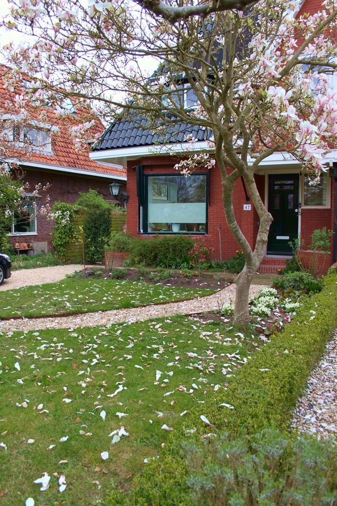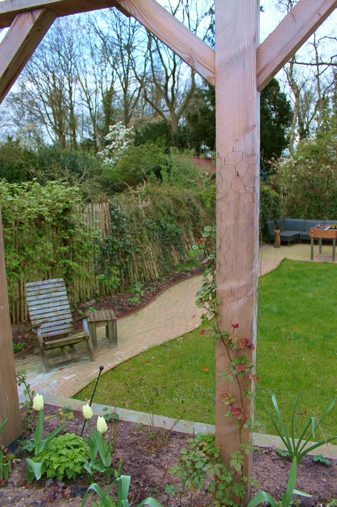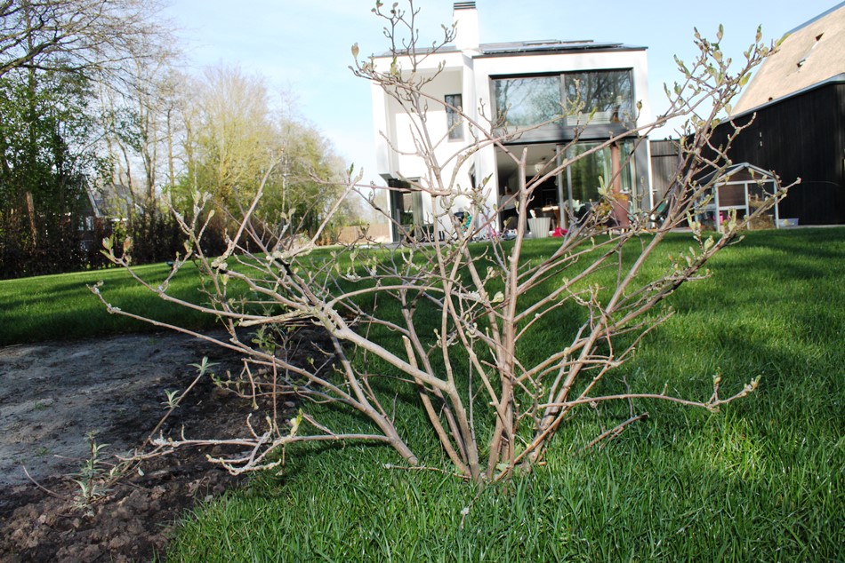 Dat genieten komt vast wel goed. Want hoewel de tuin vrij letterlijk bijna helemaal op de schop ging, is het nu in april al een aantrekkelijke tuin met een bloeiende perenboom, prachtige witte tulpen en heel veel planten op het punt van ontluiken. De vele klimplanten zoals druif, blauwe regen, passievrucht, rozen en clematissen wachten op wat meer warmte om de hoogte in te schieten en de fluweelboom toont zijn zachte knoppen. Coby: “Ik ben heel benieuwd hoe het er straks allemaal uit gaat zien. “Ik kan niet wachten tot alles begint te groeien en in bloei staat!”