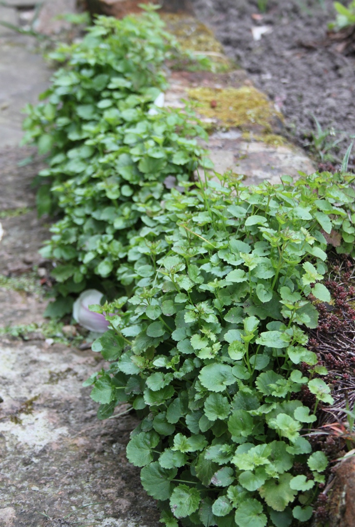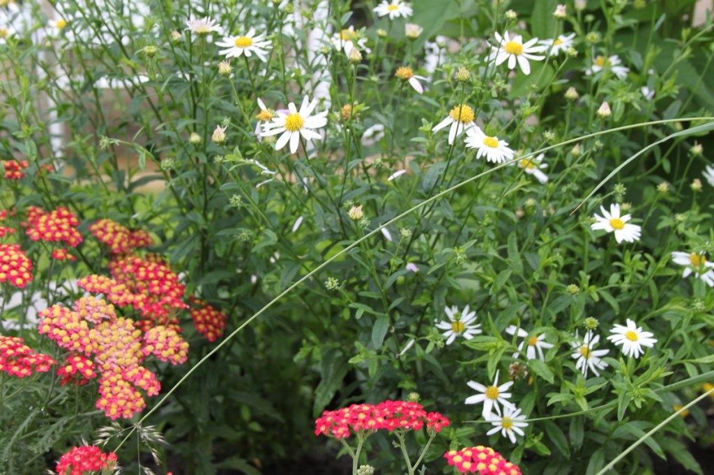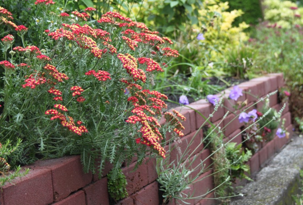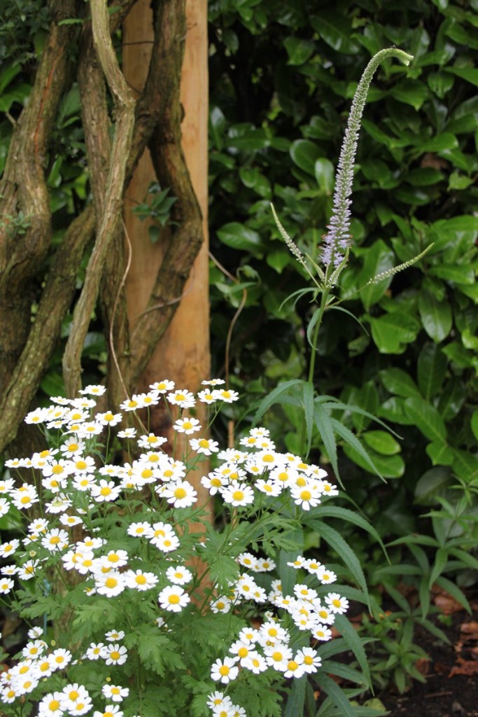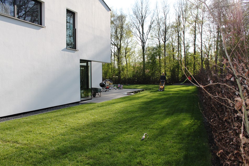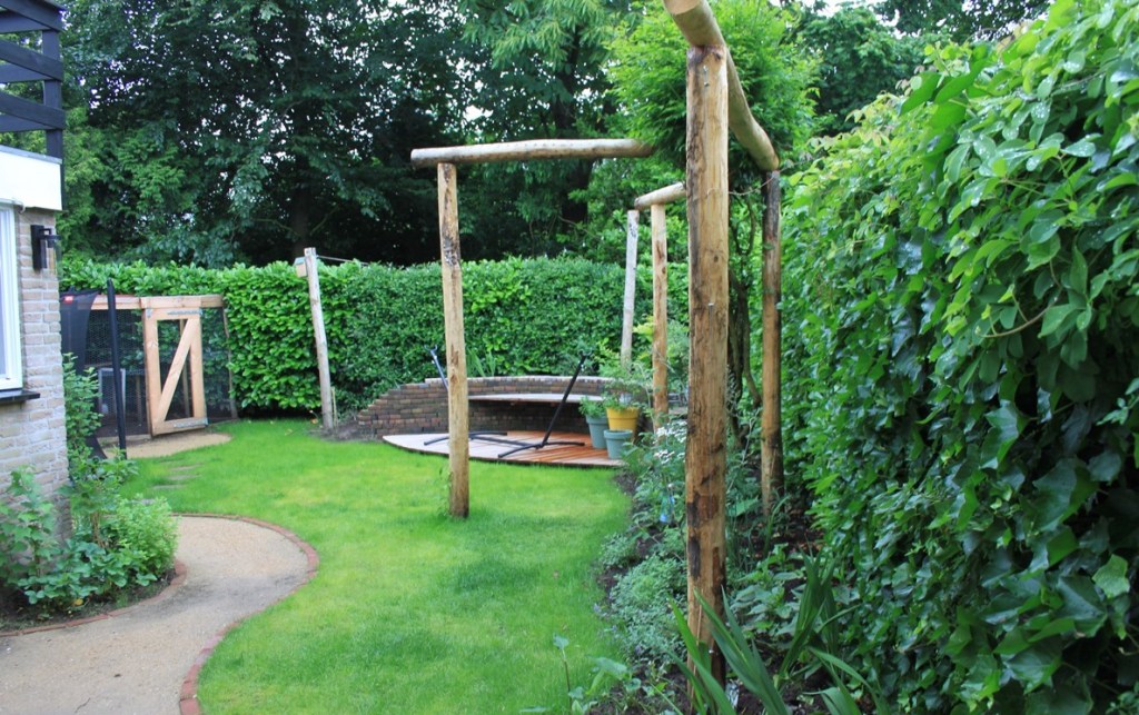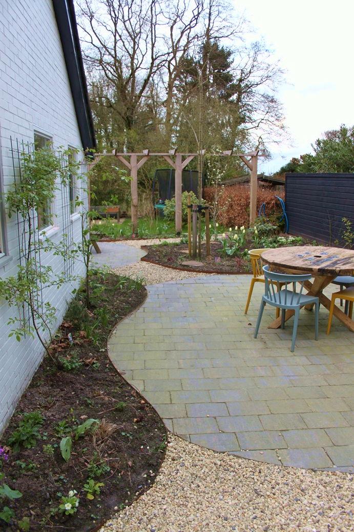 Ook tussen de verschillende ronde terrassen werd gebruik gemaakt van grind als opvulling. Het hoogteverschil werd opgevangen met een opstaande, stenen wal die geaccentueerd werd met een brede en schuin geplaatste pergola. Hierdoor ontstond een speels effect en worden de twee tuingedeeltes opgedeeld. Hoog de terrassen en de borders, in het lagere gedeelte gras en ruimte voor de trampoline van de kinderen. In de borders staan veel vaste planten zoals duizendknoop, purperklokje, ooievaarsbek, spoorbloem, damastbloem en sleutelbloem. Maar ook grassen zoals vedergras en prachtriet en heesters zoals een naaktbloeiende sneeuwbal, rododendron en vlinderstruik.